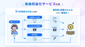 楽曲収益化サービスとは、あなたのオリジナル楽曲の収益化をお手伝いするサービスです。誰でも登録料・年会費が無料で1曲から申請可能!